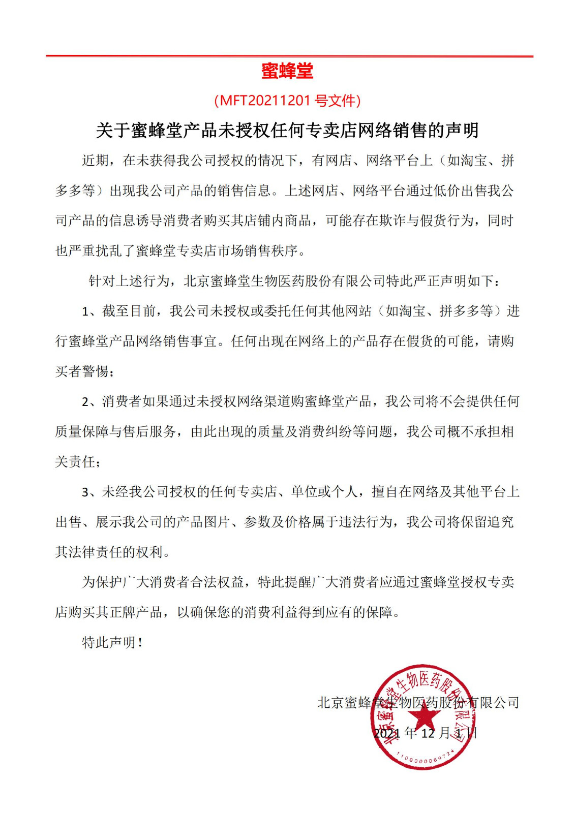 關(guān)于蜜蜂堂產(chǎn)品未授權(quán)任何專賣店網(wǎng)絡(luò)銷售的聲明