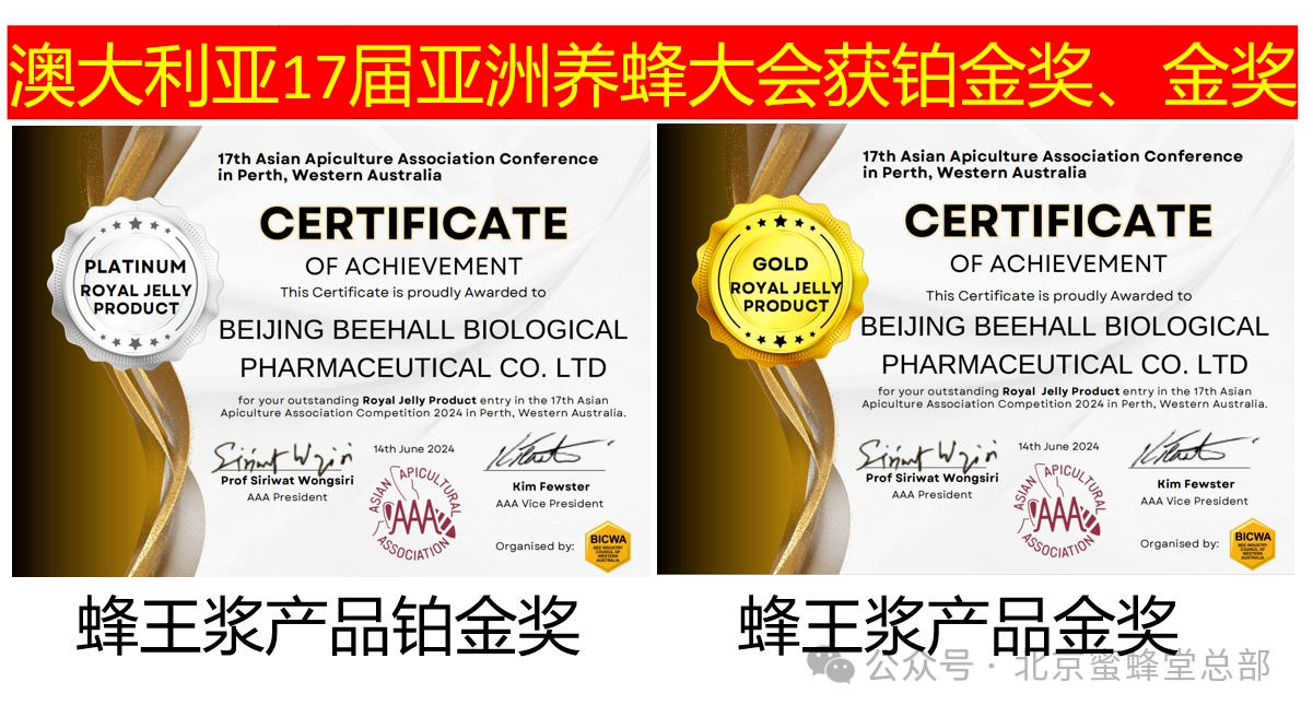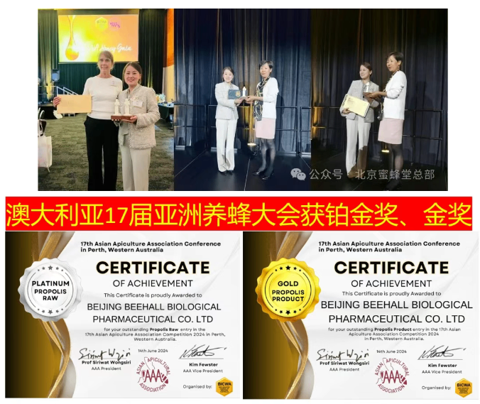 2024年初北京蜜蜂堂在澳大利亞蜂業(yè)大會上,蜂王漿、蜂膠產(chǎn)品摘得全球首個最高獎項雙鉑金獎。