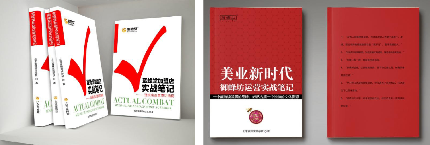 蜜蜂堂商學院自成立以來,憑借從廠家、經(jīng)銷商和門店運營收獲的實戰(zhàn)歷練,總結出一套豐富、實用、有效的經(jīng)驗方法,并練就敏銳的市場洞察力,準確切分市場,并將這套經(jīng)驗方法整理成冊《蜜蜂堂加盟店實戰(zhàn)筆記》及《美業(yè)新時代·御蜂坊運營實戰(zhàn)筆記》。